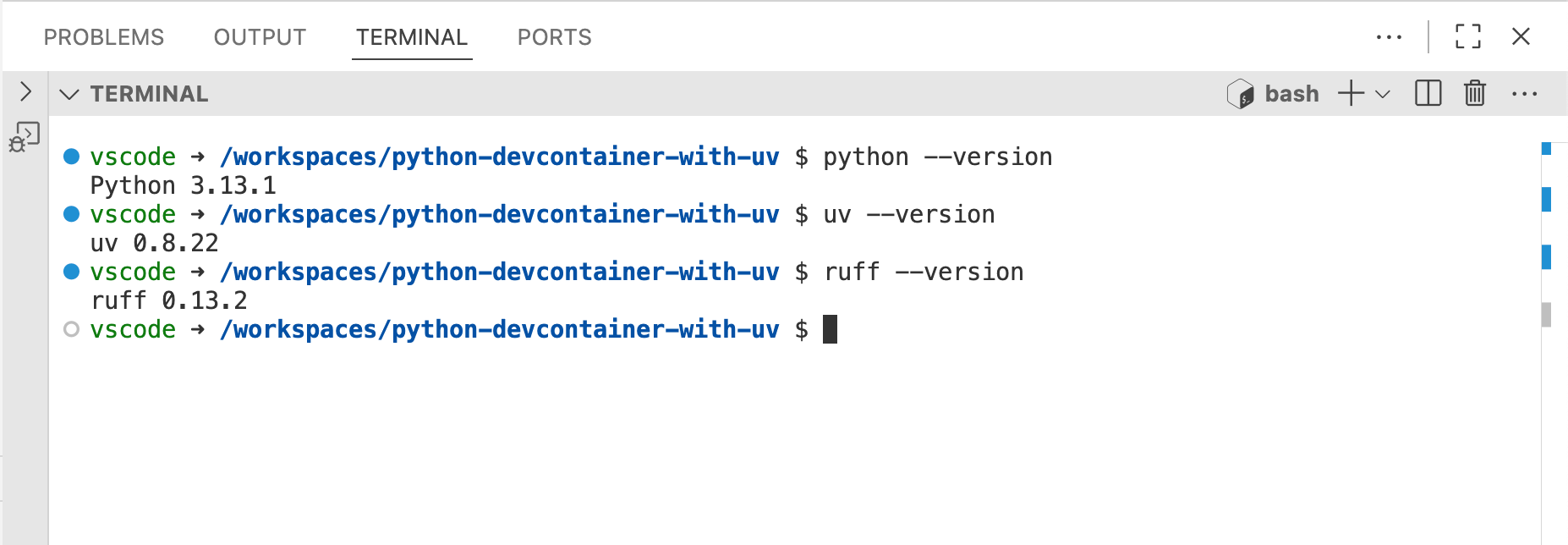 Upon opening our Devcontainer, the features we defined earlier are installed for us. Python, uv and ruff are all there:
