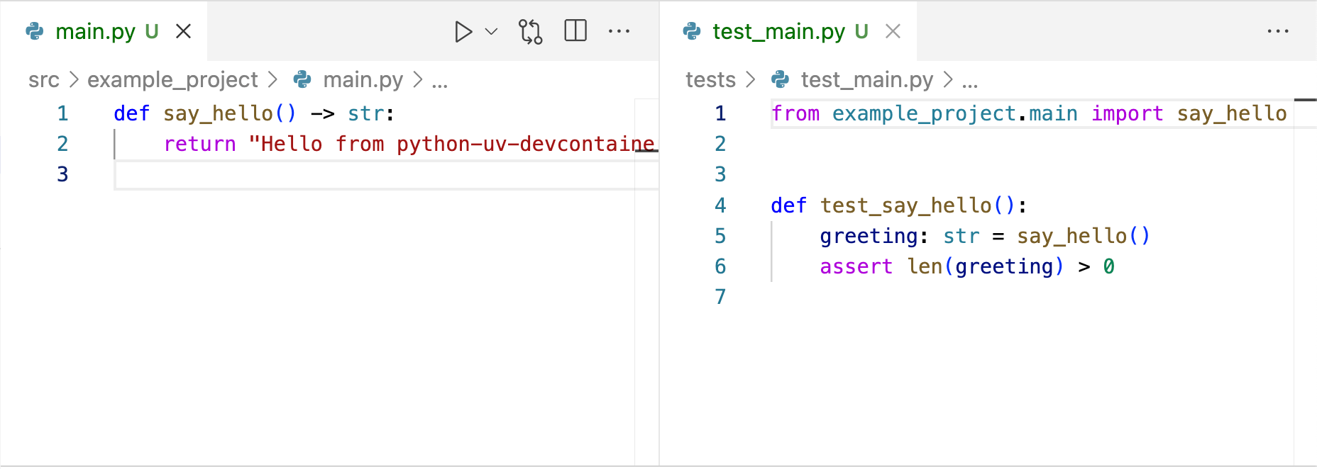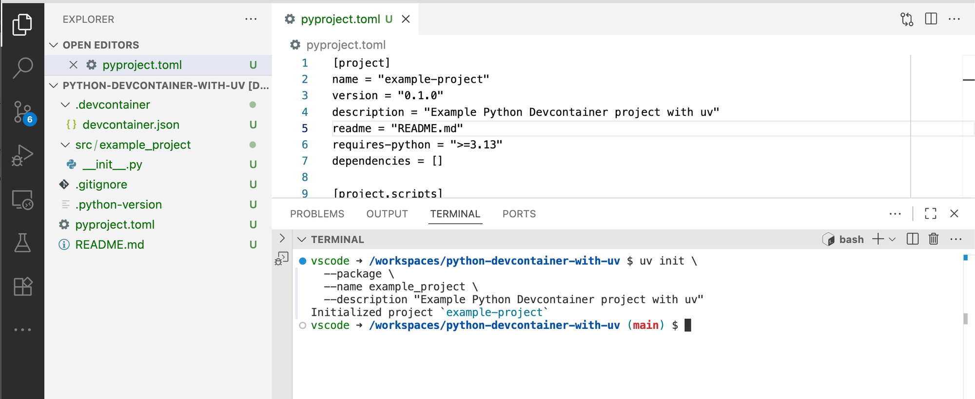 uv init \ --package \ --name example_project \ --description "Example Python Devcontainer project with uv"